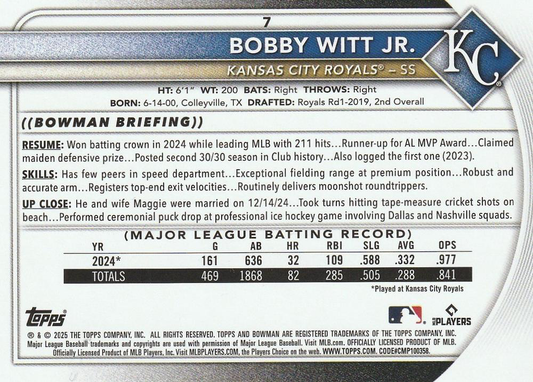2025 Topps Bowman Bobby Witt Jr. Kansas City Royals #7