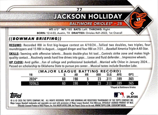 2025 Topps Bowman Jackson Holliday Baltimore Orioles #77