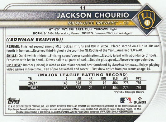 2025 Topps Bowman Jackson Chourio Milwaukee Brewers #11
