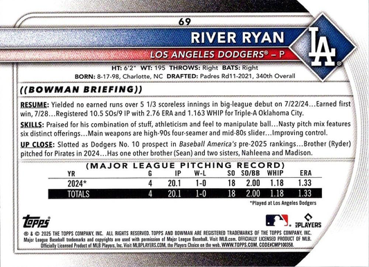 2025 Topps Bowman River Ryan RC Los Angeles Dodgers #69
