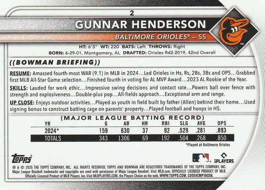 2025 Topps Bowman Gunnar Henderson Baltimore Orioles #2