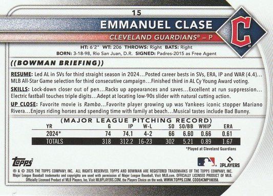 2025 Topps Bowman Emmanuel Clase Cleveland Guardians #15