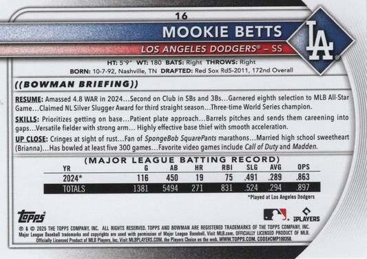 2025 Topps Bowman Mookie Betts Los Angeles Dodgers #16