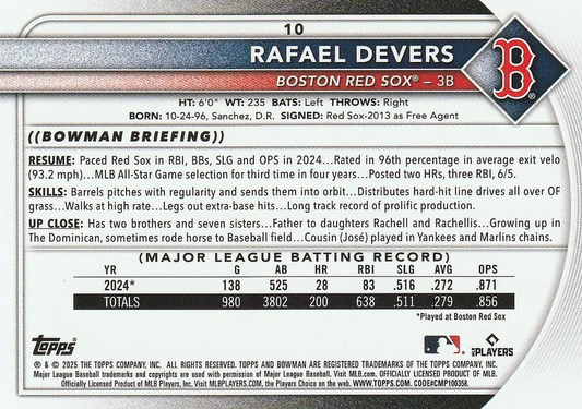 2025 Topps Bowman Rafael Devers Boston Red Sox #10