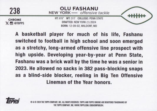 2024 Topps Chrome Football X- Fractor Olu Fashanu RC #238 New York Jets