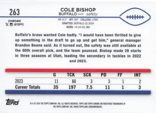 2024 Topps Chrome Football X- Fractor Cole Bishop RC #263 Buffalo Bills