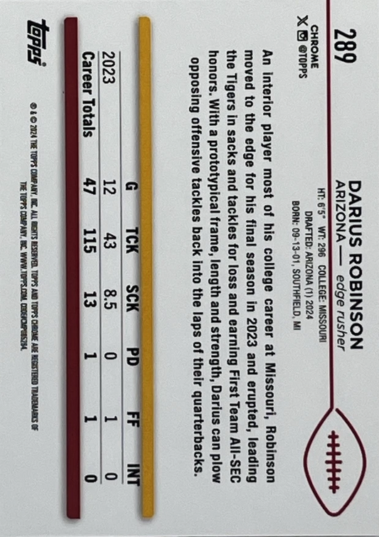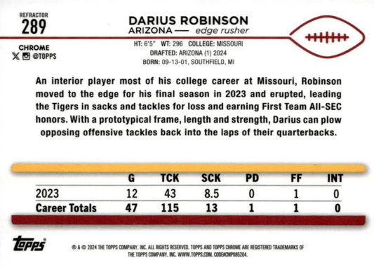 2024 Topps Chrome Football Refractor Darius Robinson RC #289 Arizona Cardinals
