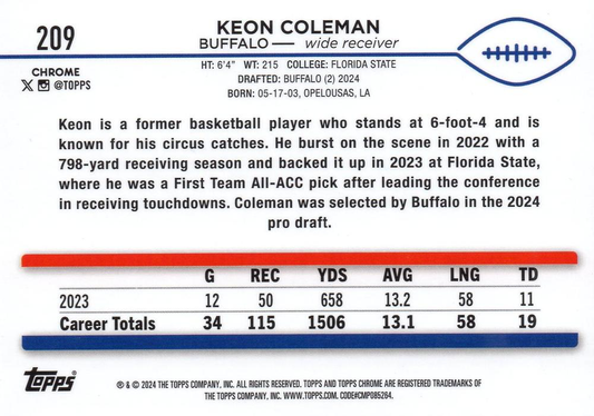 2024 Topps Chrome Football X- Fractor Keon Coleman RC #209 Buffalo Bills