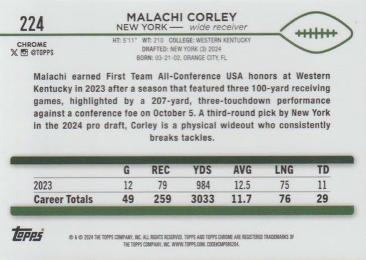 2024 Topps Chrome Football X- Fractor Malachi Corley RC #224 New York Jets