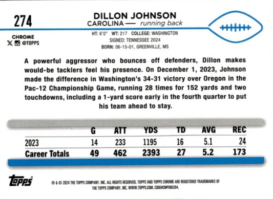 2024 Topps Chrome Football X- Fractor Dillon Johnson RC #274 Carolina Panthers