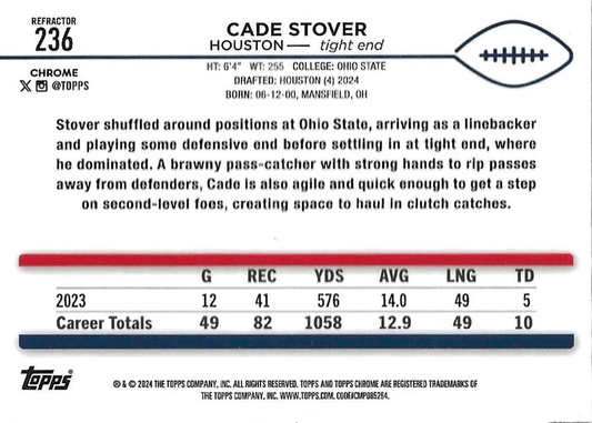 2024 Topps Chrome Football Refractor Cade Stover RC #236 Houston Texans