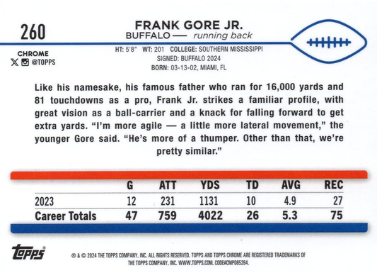 2024 Topps Chrome Football Frank Gore Jr. RC #260 Buffalo Bills