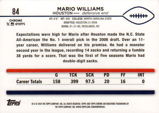 2024 Topps Chrome Football Mario Williams #84 Houston Texans