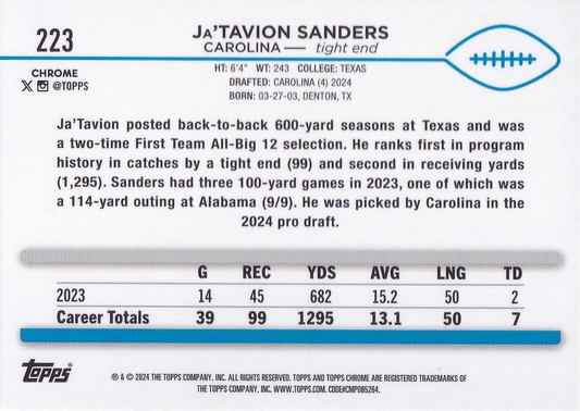 2024 Topps Chrome Football Ja'Tavion Sanders RC #223 Carolina Panthers