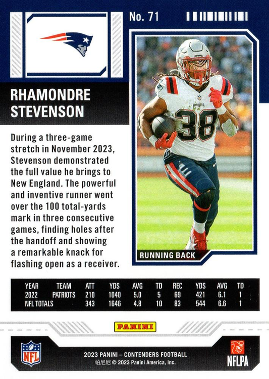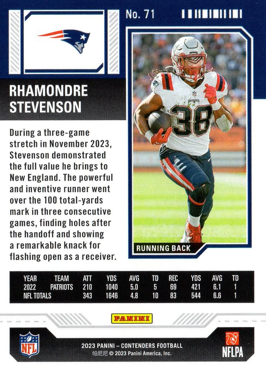 2023 Panini Contenders Rhamondre Stevenson New England Patriots #71