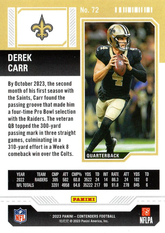 2023 Panini Contenders Derek Carr New Orleans Saints #72