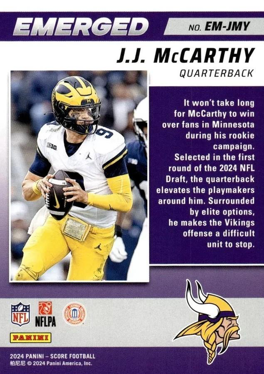 2024 Panini Score Football Emerged J.J. McCarthy Minnesota Vikings #EM-JMY RC