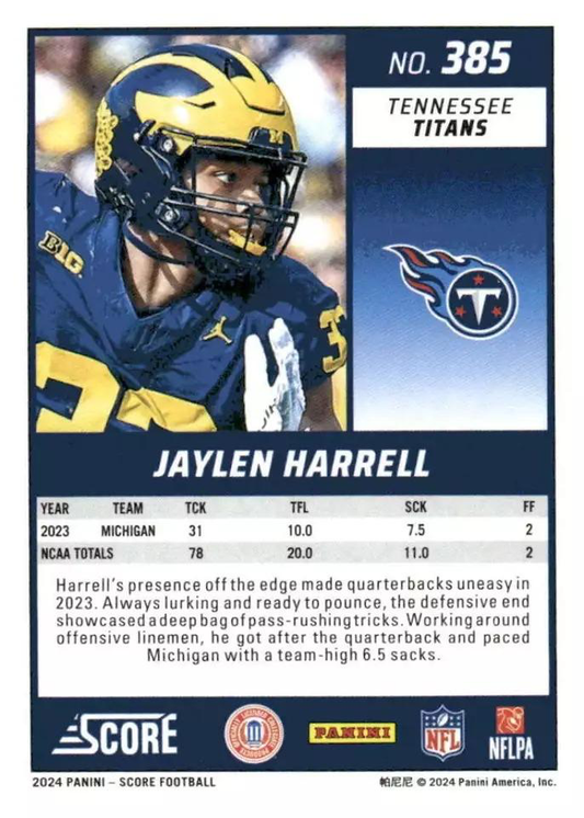 2024 Panini Score Football Jaylen Harrell Tennessee Titans #385 RC