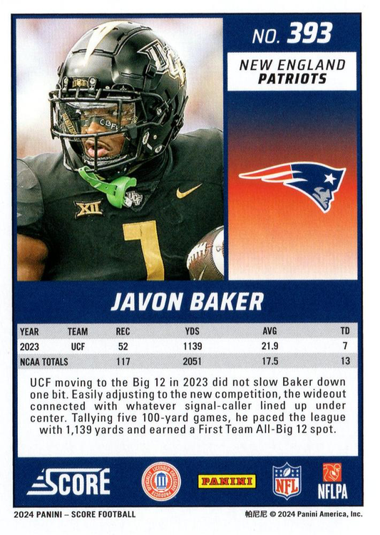 2024 Panini Score Football Javon Baker New England Patriots #393 RC