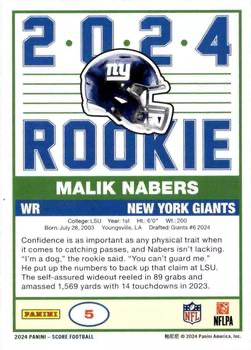 2024 Panini Score Football 35th Anniversary Rookies Malik Nabers New York Giants #5 RC