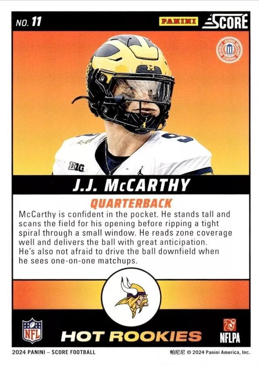 2024 Panini Score Football Hot Rookies J.J. McCarthy Minnesota Vikings #11 RC