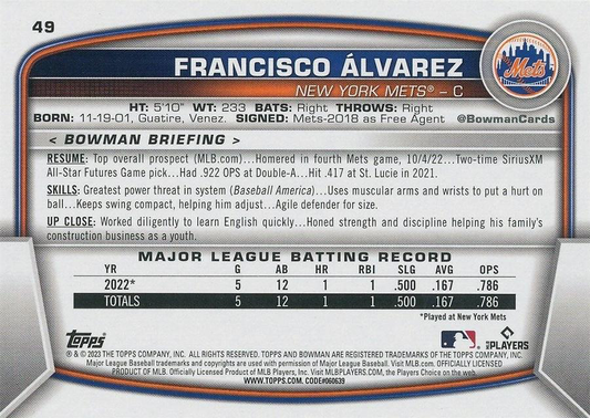 2023 Topps Bowman Francisco Alvarez RC New York Mets #49