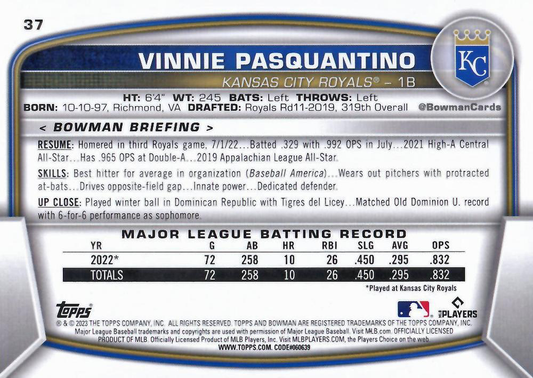 2023 Topps Bowman Vinnie Pasquantino RC Kansas City Royals #37
