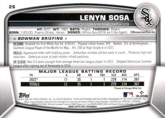 2023 Topps Bowman Lenyn Sosa RC Chicago White Sox #26