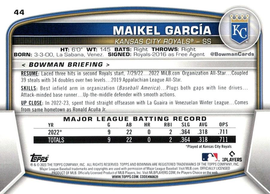 2023 Topps Bowman Maikel Garcia RC Kansas City Royals #44