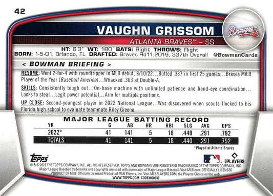 2023 Topps Bowman Vaughn Grissom RC Atlanta Braves #42