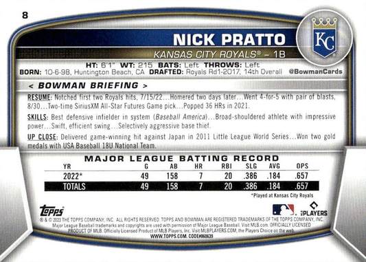 2023 Topps Bowman Nick Pratto RC Kansas City Royals #8