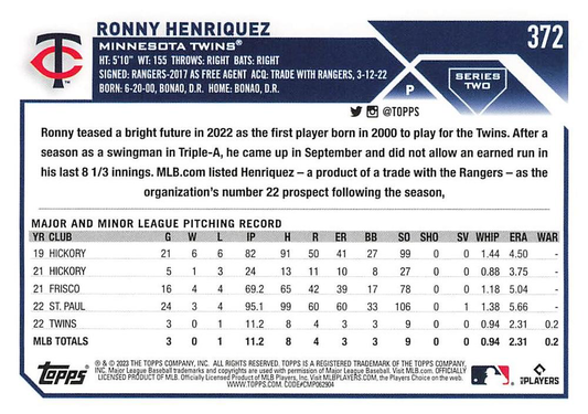 2023 Topps Series 2 Ronny Henriquez RC Minnesota Twins #372