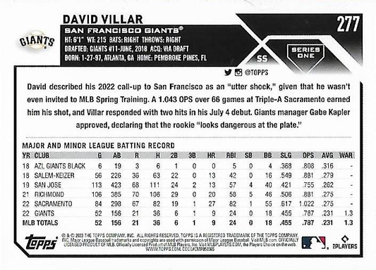 2023 Topps Series 1 David Villar RC San Francisco Giants #277