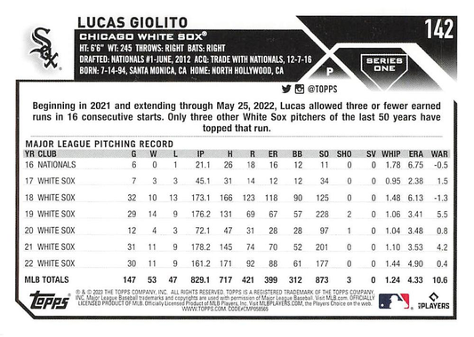 2023 Topps Series 1 Lucas Giolito Chicago White Sox #142
