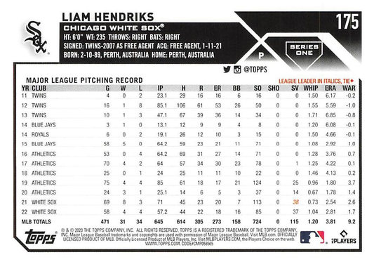 2023 Topps Series 1 Liam Hendriks Chicago White Sox #175