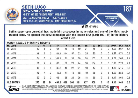 2023 Topps Series 1 Seth Lugo New York Mets #187