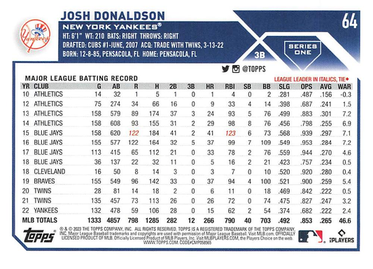 2023 Topps Series 1 Josh Donaldson New York Yankees #64