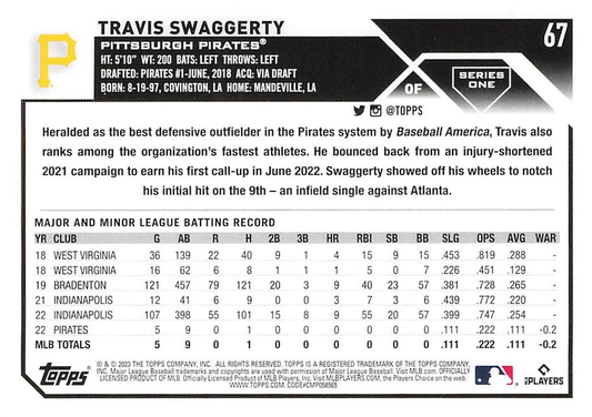2023 Topps Series 1 Travis Swaggerty RC Pittsburgh Pirates #67