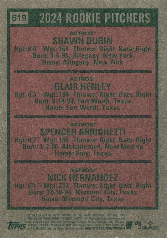 2024 Topps Heritage Rookie pitchers Shawn Dubin / Blair Henley / Spencer Arrighetti / Nick Hernadez Houston Astros RC #619