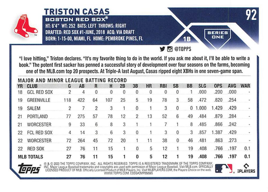 2023 Topps Series 1 Triston Casas RC Boston Red Sox #92