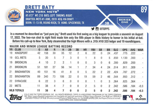 2023 Topps Series 1 Brett Baty RC New York Mets #89