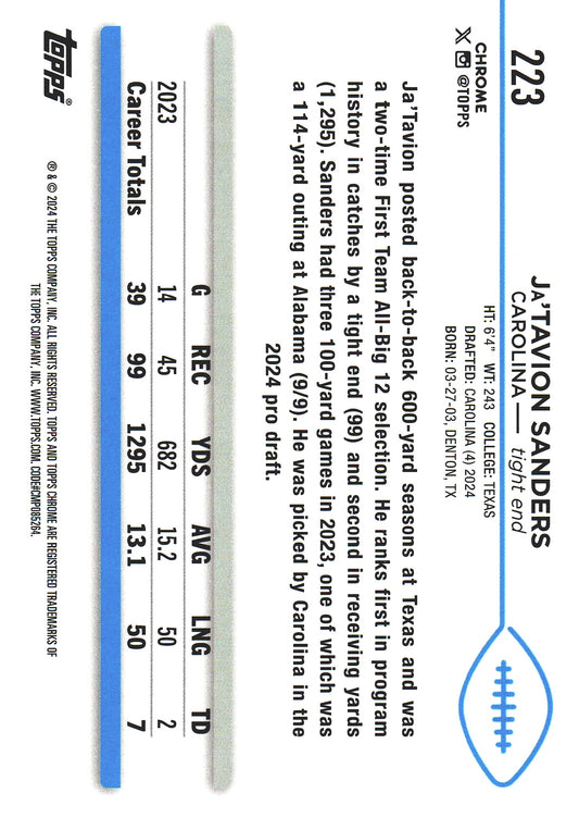 2024 Topps Chrome Ja'Tavion Sanders Aqua Pulsar RC /199 #223 Panthers