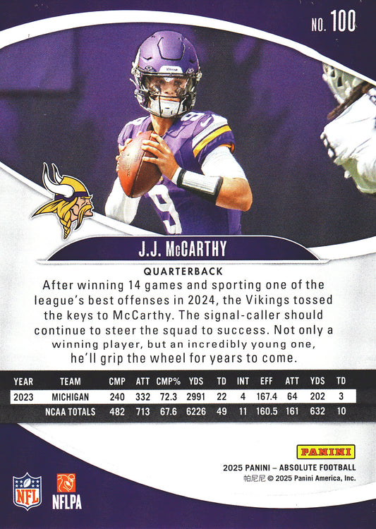 2025 Panini Absolute Hobby Red /199 J.J. McCarthy #100 Minnesota Vikings