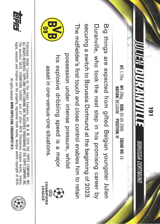 2023 Topps Chrome UCC Prism Refractor Julian Duranville RC #191 Borussia Dortmund