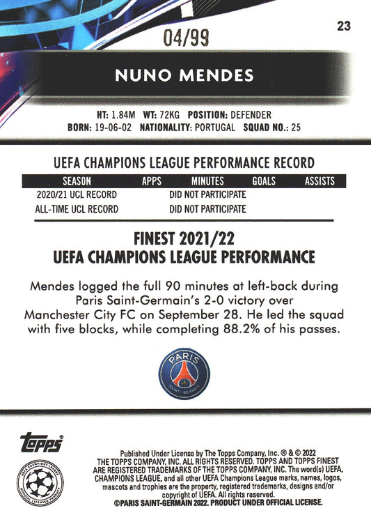 2021 Topps Finest UCC Aqua Vaporwave /99 Nuno Mendes RC #23 Paris Saint-Germain