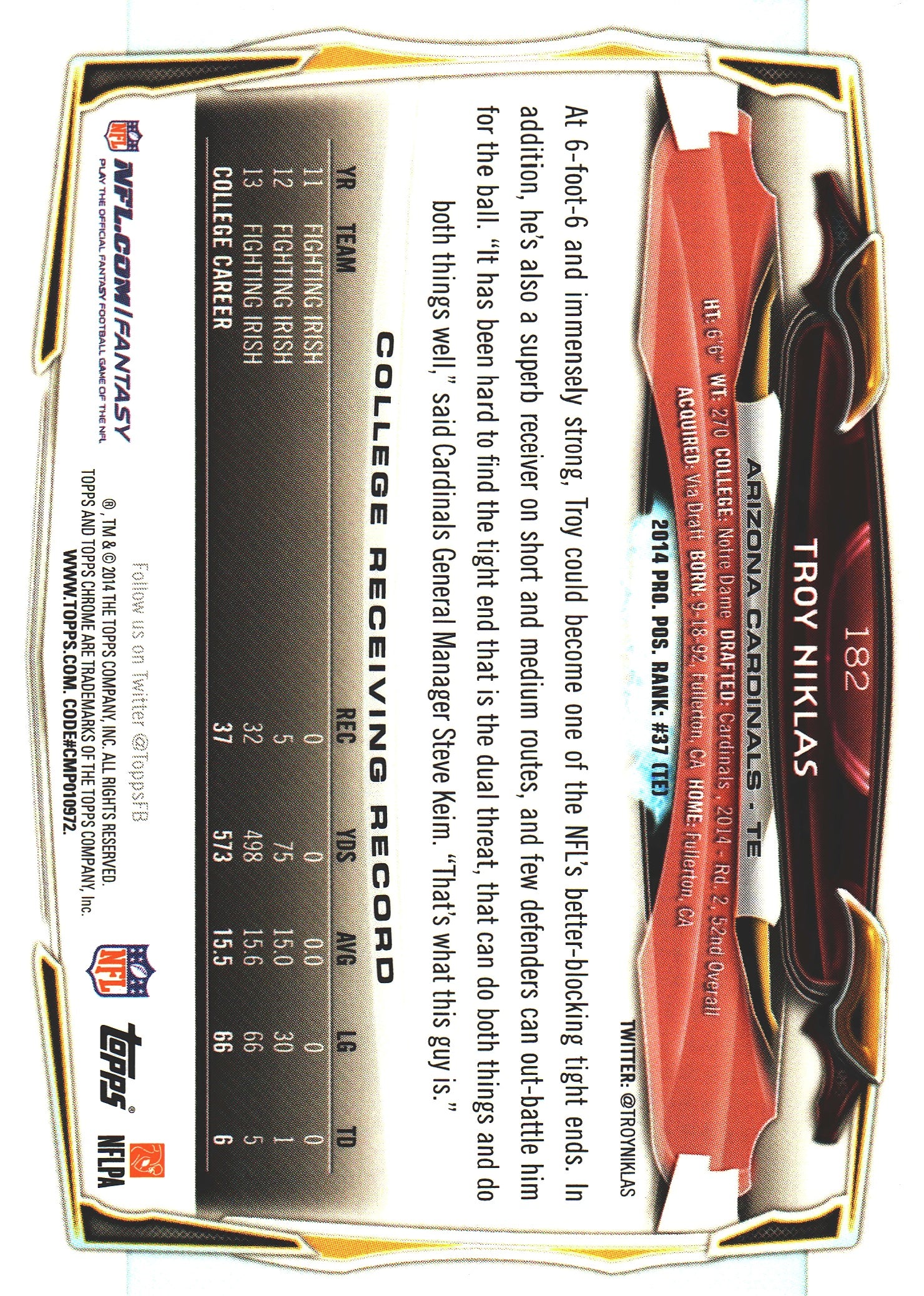 2014 Topps Chrome NFL Troy Niklas RC #182 Arizona Cardinals