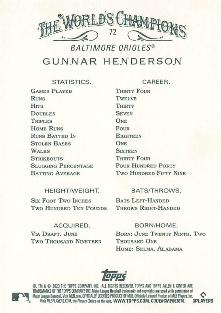 2023 Topps Allen & Ginter Gunnar Henderson RC Baltimore Orioles #72