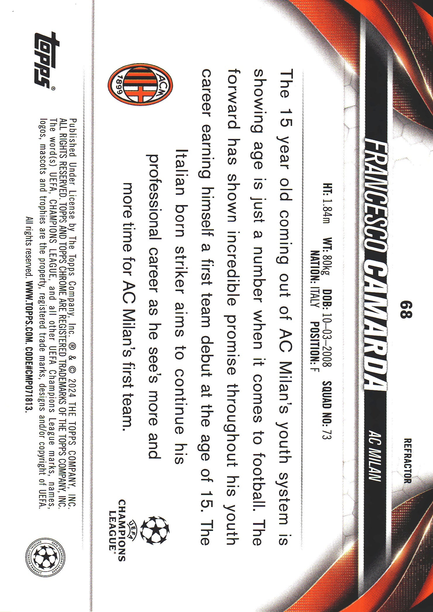 2023 Topps Chrome UCC Refractor Francesco Camarda RC #68 AC Milan