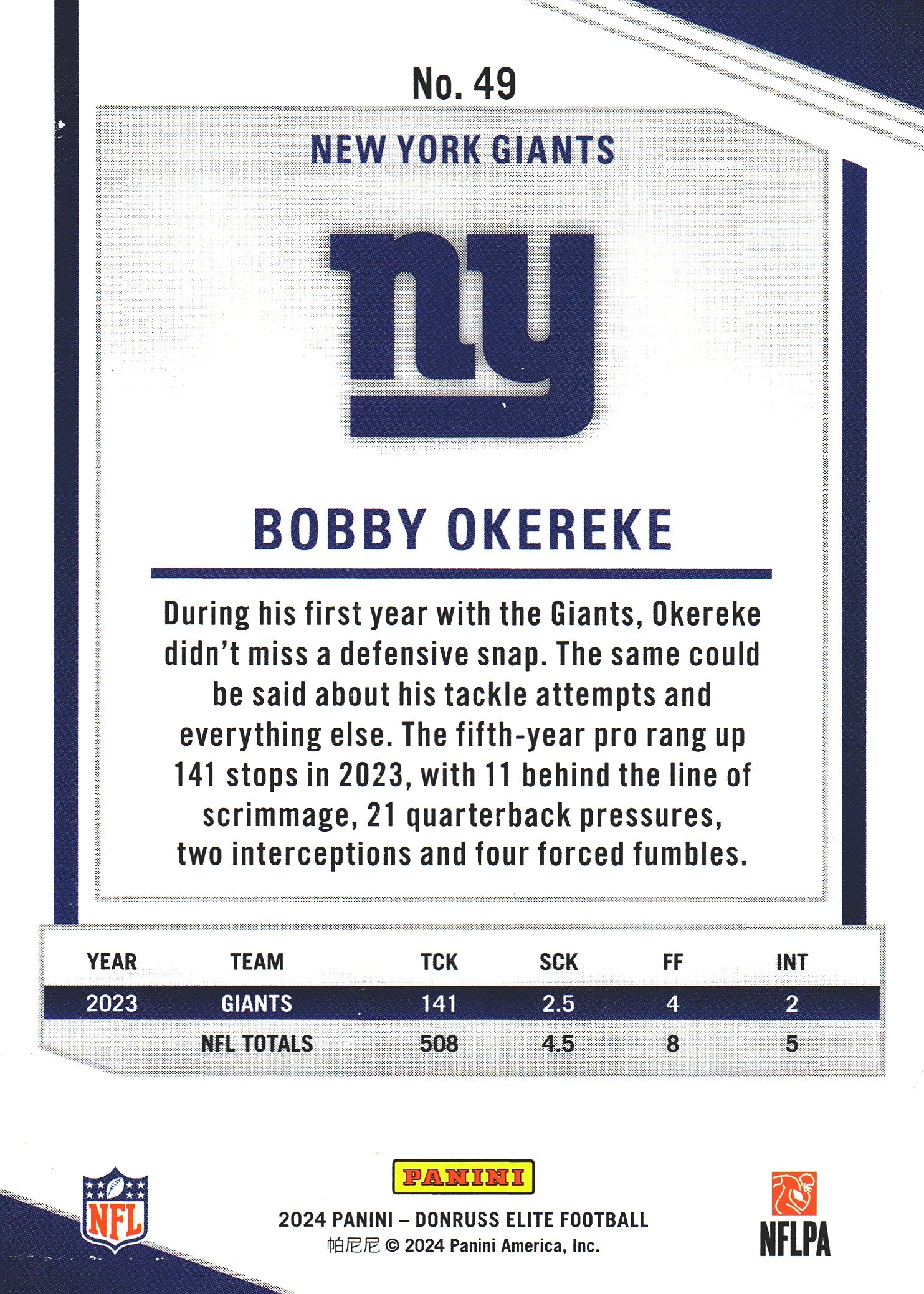 2024 Panini Donruss Elite Bobby Okereke #49 New York Giants