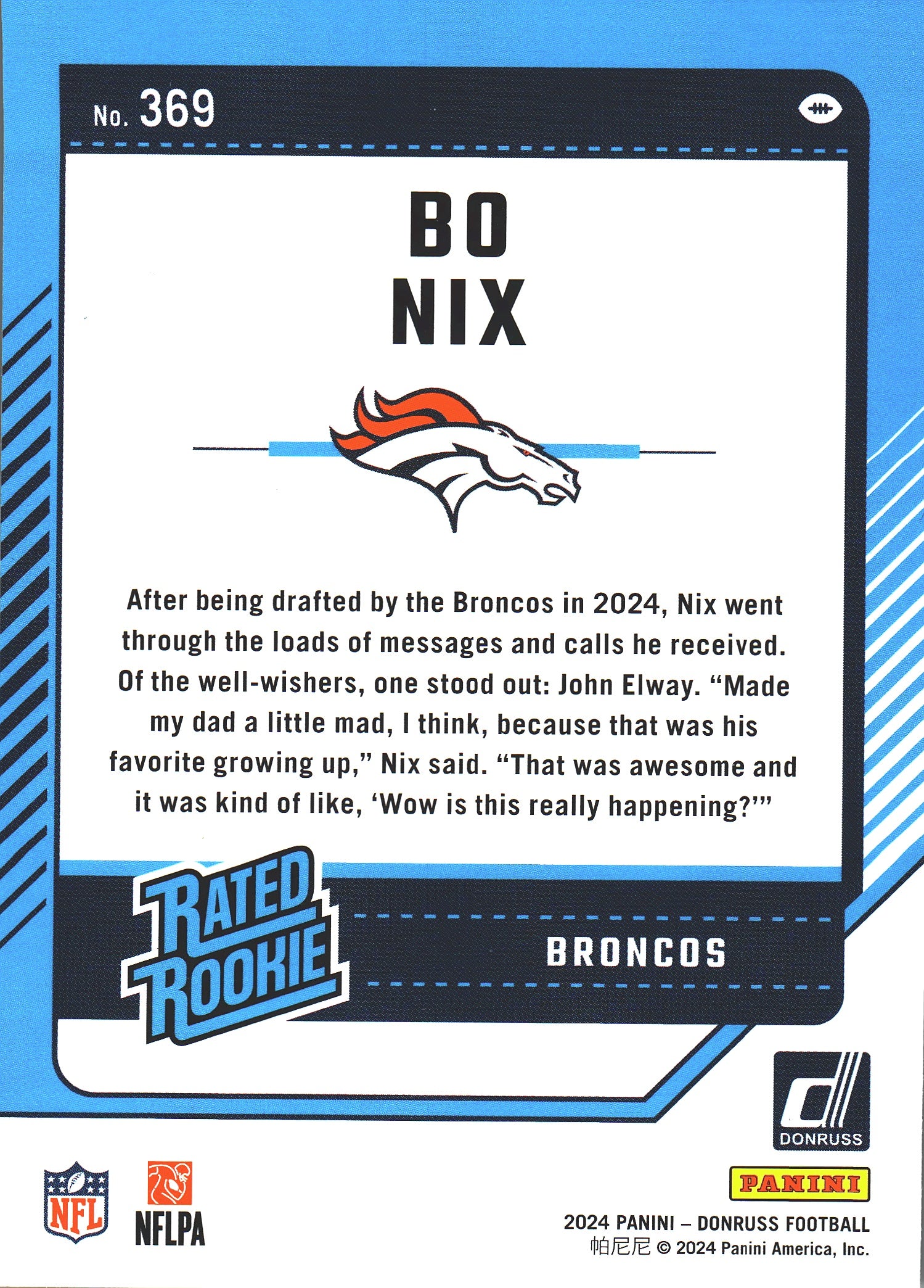 2024 Panini Donruss Rated Rookie Bo Nix RC #369 Denver Broncos